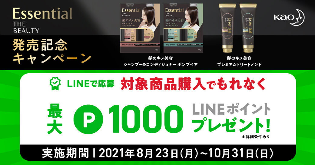 期間中、Essential THE BEAUTY「髪のキメ美容シリーズ」の発売を記念して、対象商品を購入すると、最大1,000LINEポイントが貰えるキャンペーンです。