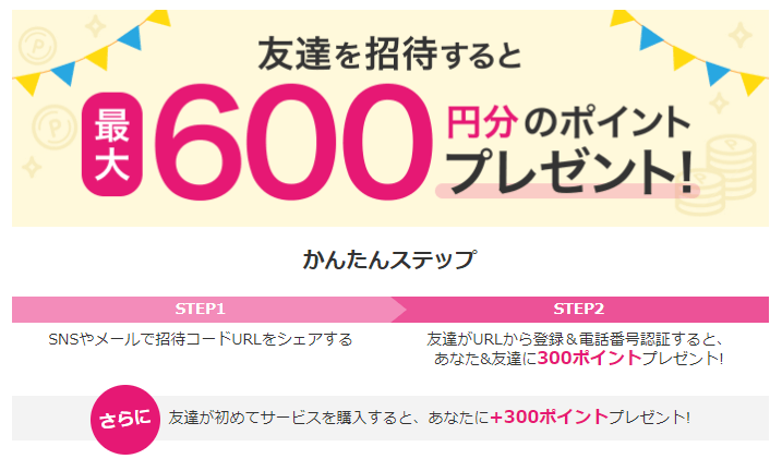 ・招待コード経由で友達が会員登録し、電話番号認証を行うとそれぞれに300ポイント付与