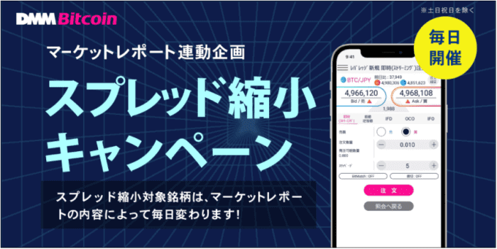 DMM Bitcoin(DMMビットコイン)のスプレッド縮小キャンペーンが毎月開催中!WEBサイトに掲載しているマーケットレポートをご確認ください!