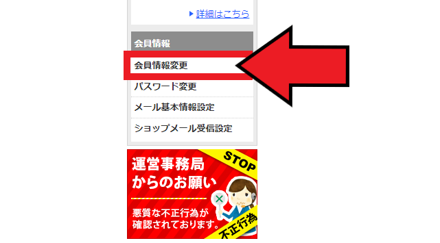 ②左側のメニュー下部にある「会員情報変更」をクリック↓