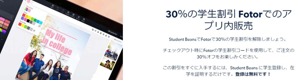 Student Beansに無料登録し学生であることを証明するだけで、Fotor(フォター)利用料金が30%オフになるキャンペーンが行われています。
