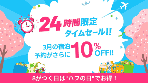 対象エリアの宿泊予約が10%オフになる24時間限定タイムセールが開催されることがあります!