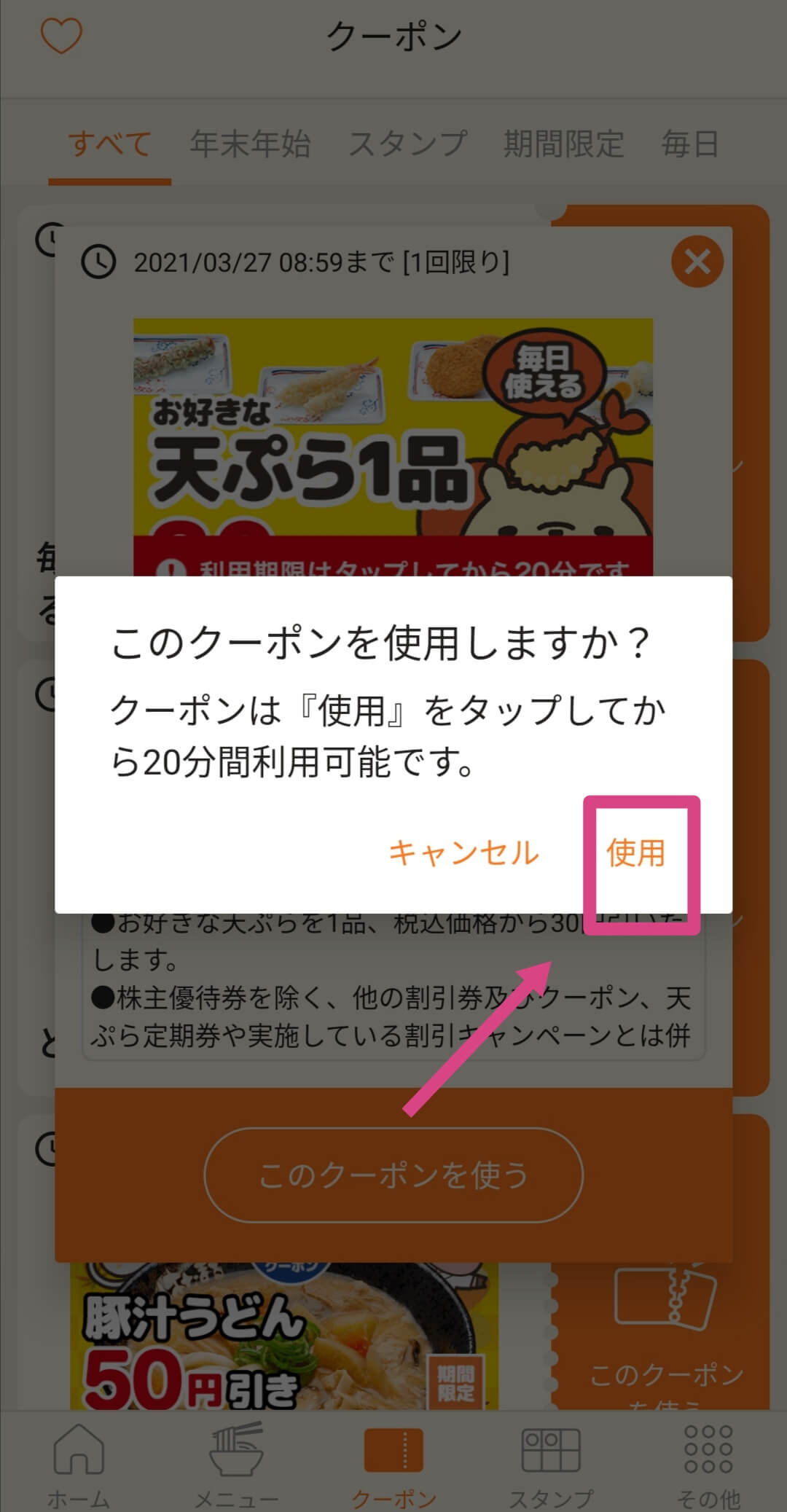 アプリで「このクーポンを使う」をタップしてから20分間有効