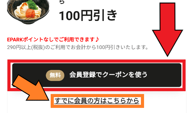 はなまるうどんのクーポン一覧から使いたいクーポンをタップするとクーポン詳細画面になります↓