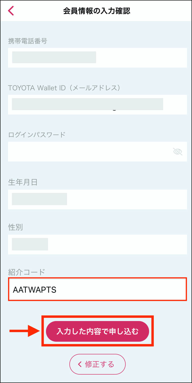 残りの会員情報を指定後、紹介コード欄に『AATWAPTS』と入力し、