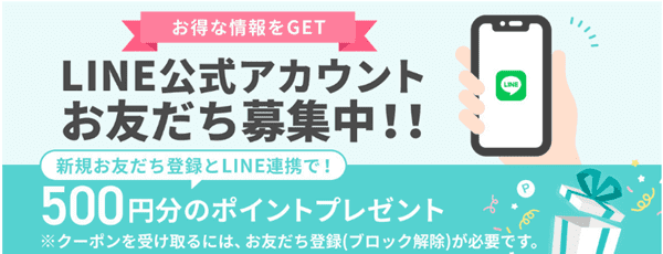 | キャンペーン特典 | LINE公式アカウントお友だち追加で500円分ポイントもらえる |