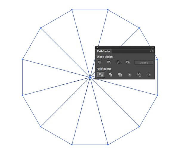 ポリゴンのコーナーを切り取ったら、ポリゴンのオブジェクトの周りに選択範囲を描画します。 次に、パスファインダーで[分割]ボタンをクリックして、ポリゴンを12個の三角形セグメントに分割します。 ポリゴンを個々の部分に分割するには、ドキュメントを右クリックして[グループ解除]を選択します。