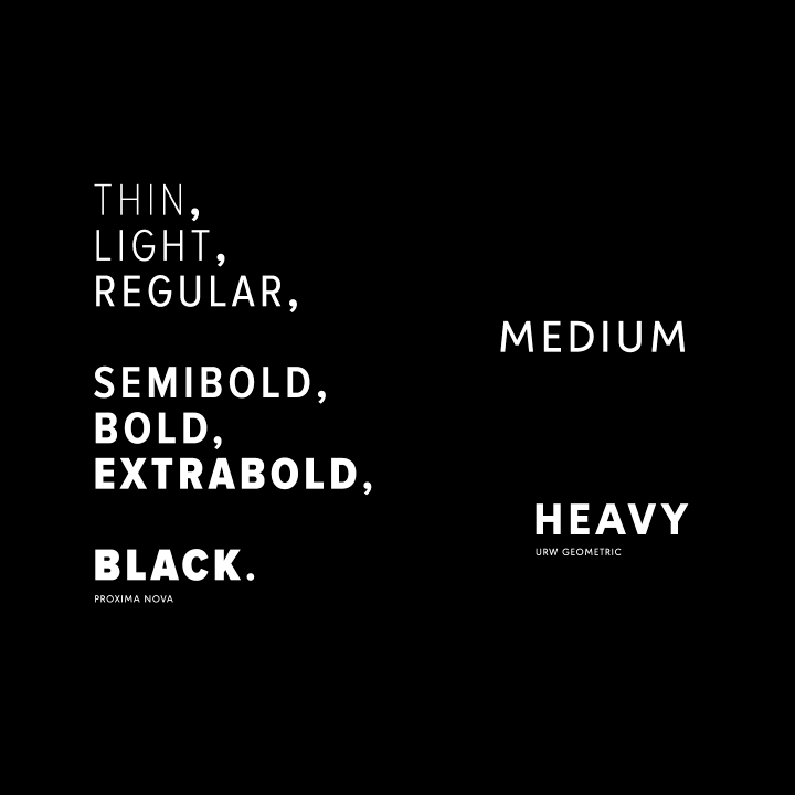 これらはフォントのウェイト(weight:太さを相対的に示すもの)やスタイル(個々の用途に合わせて作ったバージョン)に関するものです。そしてウェイトは字の「高さに対する割合」によって定義されます。