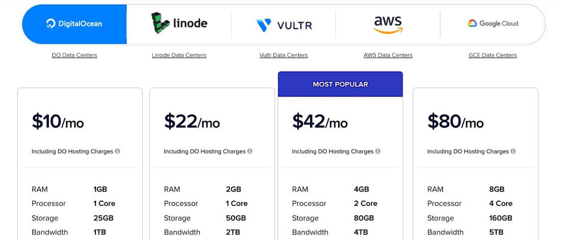 ユーザはDigital Ocean、Linode、AWS、Google Cloud、Vultrの5つの異なるデータセンターから選択できます。各データセンターは、Cloudways独自の機能でカスタマイズされています。