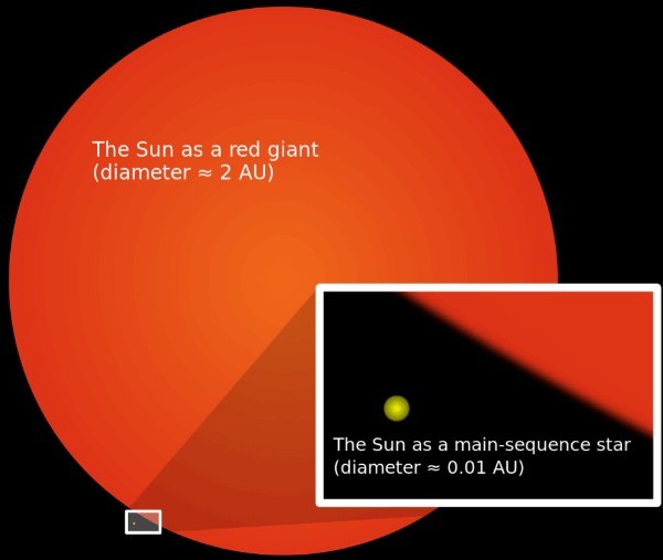赤色巨星としての太陽の概念図(参考として現在の太陽が挿入されている)