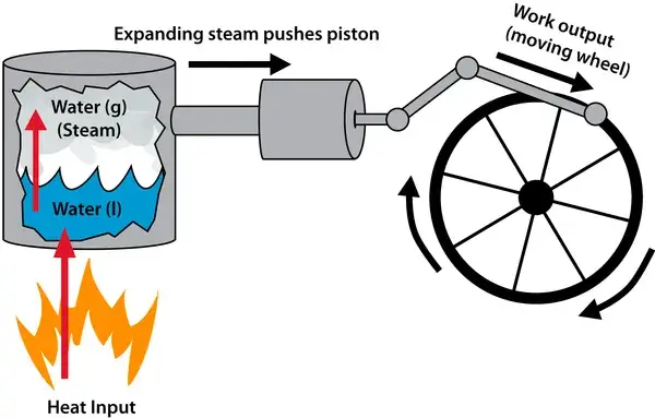身近なところでは、蒸気機関車、内燃機関、火力発電所などが熱機関です。いずれも、熱せられた気体の膨張を動力源としています。