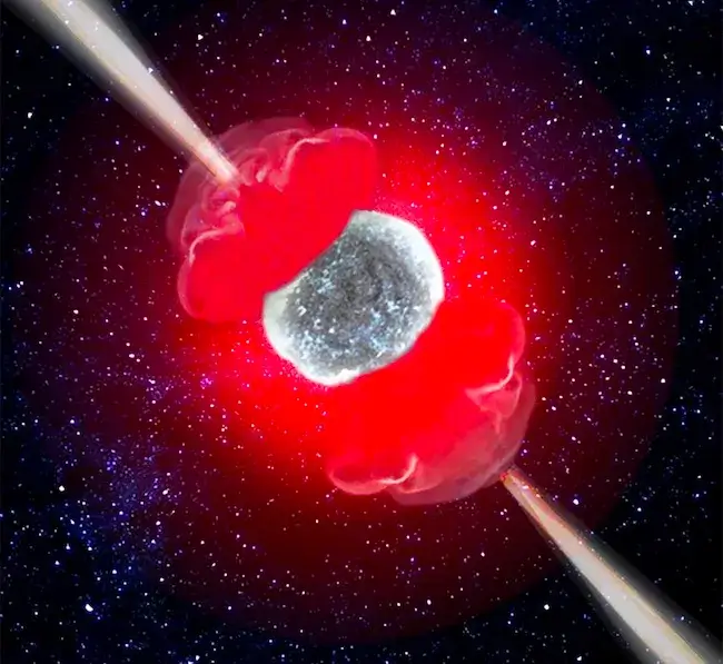 今回、研究チームは太陽の25倍以上の質量を持つ星を観測しました。このような巨大な星は、核燃料(水素とヘリウム)がなくなると崩壊し、外層が超新星として爆発します。超新星爆発の後に残るのは、中性子星かブラックホール(十分な質量がある場合)に変化する非常に密度の高い星の核で、同じ瞬間に2つの極性噴射物質が放出されます。