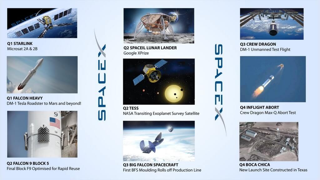この画像に挙がっているのは、衛星ブロードバンド「スターリンク」(マイクロサット2Aおよび2B)、超大型ロケット「ファルコンヘビー」、商業用打ち上げロケット「ファルコン9ブロック5」、NASAのトランジット系外惑星探索衛星、宇宙船「BFS(Big Falcon Spacecraft)」、宇宙船「クルードラゴン」の無人テスト飛行、そしてテキサスの新しい打ち上げ基地の建設などです。